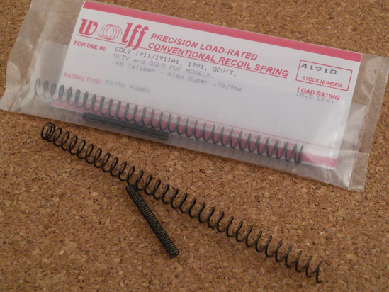 Harrison Design now carries Wolff recoil springs for your convenience. We offer the Wolff Conventional rate springs so you have an even compression rate as the slide travels rearward. You also get a stiffer initial opening rate from "in battery", which works along with a standard power firing pin sring and a small radius firing pin stop to slow the slide's opening. Available in the common weight rates and comes with an extra power firing pin retun spring.